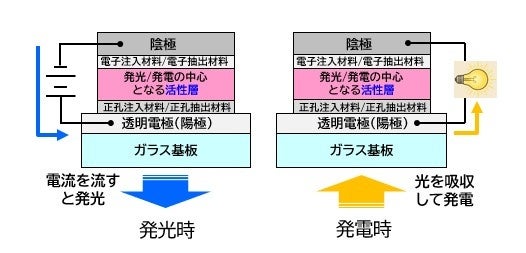 半導体の性質を持つ有機物は有機半導体と呼ばれ、有機半導体を用いて、発光機能をもつ有機ELや発電機能をもつ有機太陽電池の開発が一般的に広く進められています。有機ELと有機太陽電池は、デバイス構成が類似していますが動作原理が異なります。有機ELは電極から流れ込んだ電荷(正孔と電子)を結合させて発光するのに対し、有機太陽電池では外部からの光を吸収することで生成した電荷を分離させて発電するという逆の原理によって動作します。発光と発電には、それぞれに適した材料とデバイス設計があり、これらはトレードオフとなるため1つのデバイスで2つの機能を両立することは非常に困難でした。