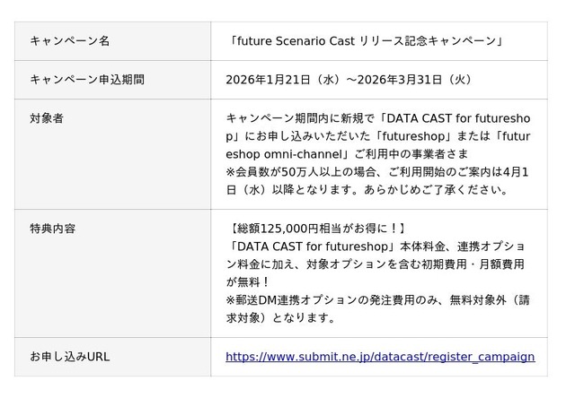 2026年4月の「future Scenario Cast」提供開始に向け、現在提供している「DATA CAST for futureshop」の先行導入キャンペーンを実施します。