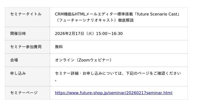 SaaS型ECサイト構築プラットフォーム「futureshop」を提供する株式会社フューチャーショップ(本社:大阪市北区、代表取締役:星野 裕子)は、EC事業者のメールマーケティング・CRM/MA活用をより始めやすく、運用しやすくする新サービス 「future Scenario Cast」 を、2026年4月より「futureshop」「futureshop omni-channel」ご利用者向けに提供開始いたします。