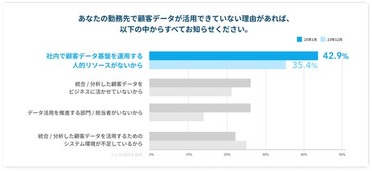 現在、マーケティング施策の高度化が進む一方で、多くの企業において、戦略を形にするための「データ設計/構築」や、施策を継続するための「運用実務」を自社で完結させることが困難になっています。最新の動向調査(※1)によると、データ活用が進まない最大の理由はツールの機能不足ではなく、「社内で運用する人的リソースが足りない(42.9%)」ことであり、戦略を描けたとしても、それをシステムへ実装し、PDCAを回し続けるための「専門性」と「リソース」の両面で、多くの企業が限界を感じている実態があります。