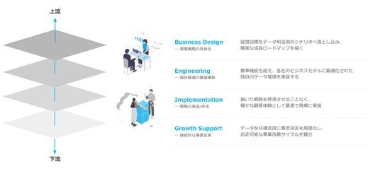 そこで、使いやすいプロダクトの提供に加え、上流の戦略立案から、専門的なデータ設計/構築、そして下流の実務実行までをトータルで支援する体制を構築しました。これにより、一貫性のあるデータ利活用を実現し、顧客のビジネス成長を加速させます。