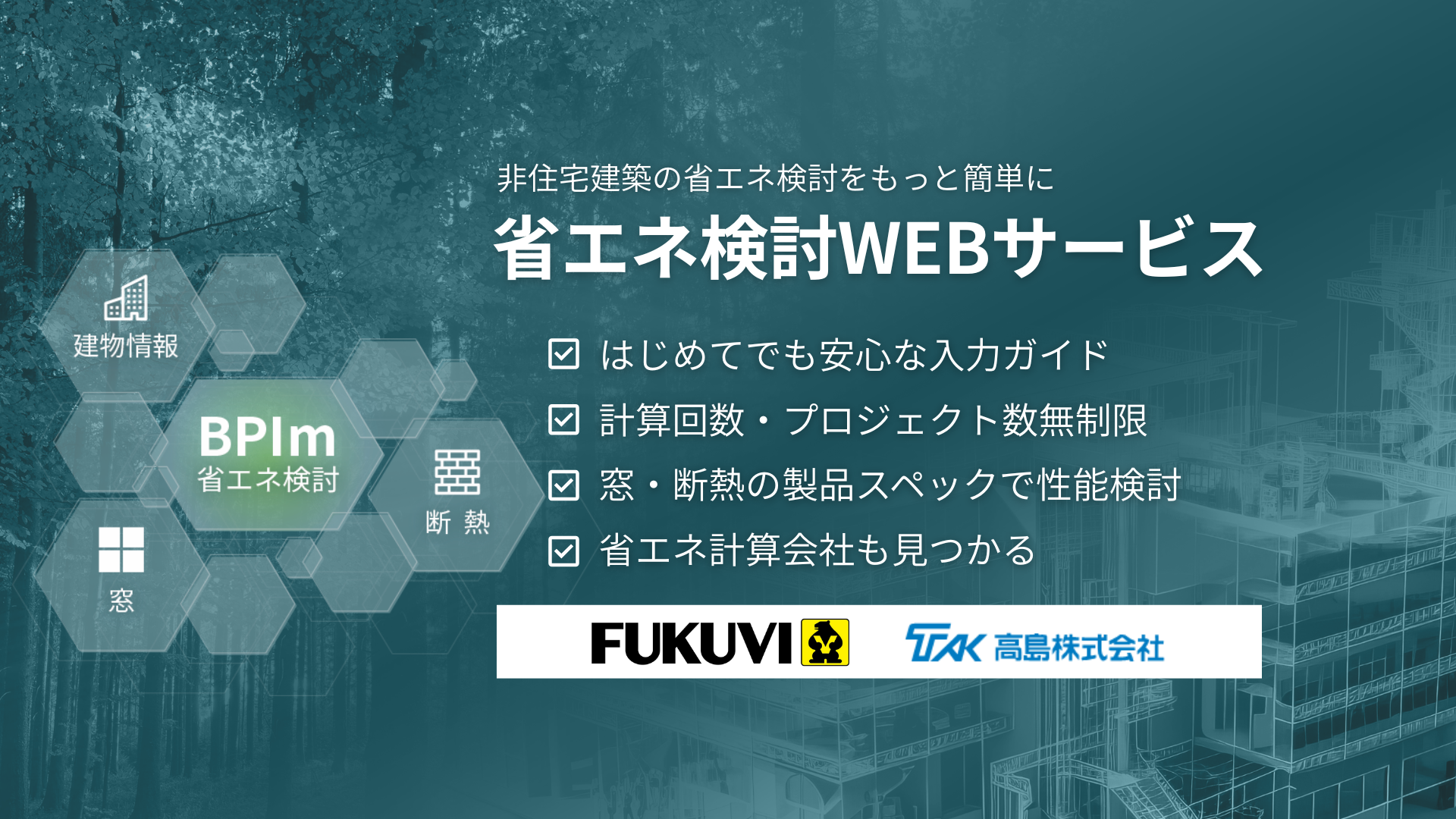 「省エネ検討WEBサービス」は、非住宅建築の外皮性能(BPIm)をWebブラウザ上で手軽に検討できるサービスです。建材選定と省エネ計算を一体で行える点が特長で、設計初期から最適な断熱仕様の検討をサポートします。