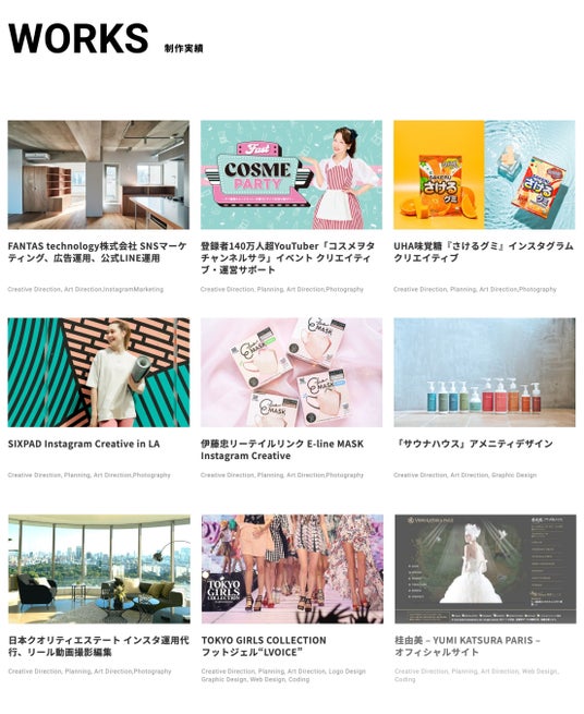事業内容:ブランディング、WEB制作・運営・コンサルティング、グラフィックデザイン、SNS運用代行、インフルエンサー・モデルキャスティング、写真・映像制作、ビジネスマッチング事業