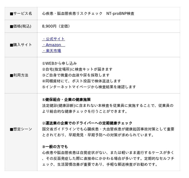 性感染症,生活習慣病などの郵送検査サービスを提供する(株)GMEでは、心疾患・脳血管疾患リスク検査としてNT-proBNP検査を実施しています。