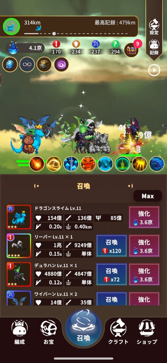ステージは倒されるまで続くサバイバル形式。プレイするたびに挑戦の限界を更新していく、緊張感あるバトルが展開されます。魔物を倒して仲間に召喚し、スキルと編成を駆使して戦うのが本作の特徴。戦いを重ねるごとに強力なボスが登場し、戦略性と歯ごたえのあるバトルが楽しめます。眷属の召喚やスキルの使いどころ、育成の方向性が攻略のカギとなり、ドロップ素材で仲間を強化しながら、状況に応じた判断力が試されます。