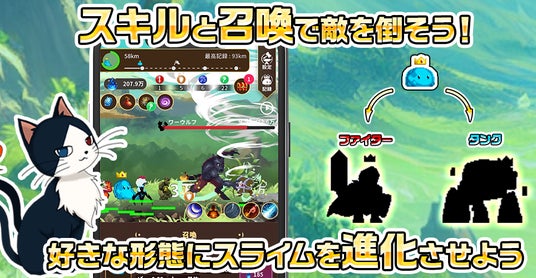 『サモナースライム』は、スライムに転生した主人公が眷属を召喚し、魔物との戦いを通じて遊び込むほど成長と強化の幅が広がっていくローグライク育成RPGです。