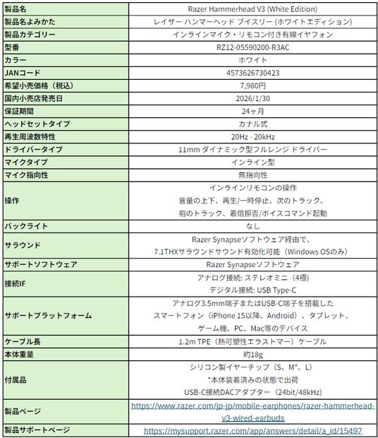 本製品は、2025年に発売された「Razer Hammerhead V3」(ブラック)のカラーバリエーションで、3.5mmプラグによるアナログ接続と同時にUSB-Cに対応することで、数多くのスマートフォン、モバイルゲーム機、パソコン等に対応しています。