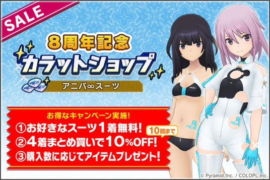 カラーリングを8パターンに変更でき、さらにアウターも着脱可能な8周年記念コスチューム「アニバ∞スーツ」が販売中です。キャラ1人分のスーツの無料プレゼントも実施しておりますので、ぜひご利用ください。