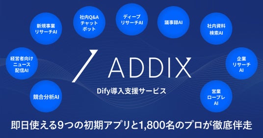 本サービスは、生成AIの活用が広がる一方で、実務への定着や成果創出に課題を抱える企業が増加している状況を背景に、ノーコード生成AIアプリ開発プラットフォーム「Dify」を活用し、自社独自の環境構築から保守・運用までを一貫して支援するサービスです。導入初日から業務で活用できる9つの生成AIアプリを標準搭載している点を特長とし、PoCに終わらない、現場の実務フローに即したAI活用を実現します。ADDIXは本サービスを通じて、生成AIを企業の業務プロセスに根付かせ、実務レベルでの変革と継続的な価値創出を支援していきます。