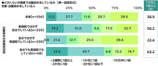 まず、どのくらいの頻度で白髪染め(根元のリタッチも含む)をしているか聞いたところ、「2週間に1回以上」が11.2%、「1か月に1回」が27.7%で、『1か月に1回以上(計)』は38.9%、「1か月半に1回」が11.0%、「2か月に1回」が20.7%、「3か月に1回以下」が29.5%となりました。