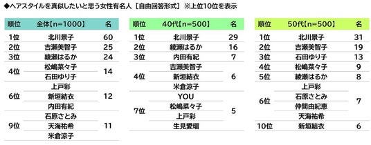 - ヘアスタイルを真似したいと思う女性有名人 「北川景子さん」がダントツ、2位「吉瀬美智子さん」