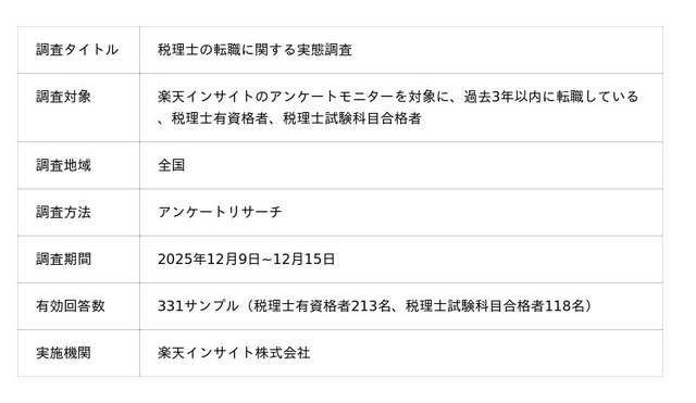 税理士や会計経理人材に特化した転職サポートを行う、株式会社レックスアドバイザーズ(https://www.career-adv.jp/)は、「税理士の転職実態に関する調査」を行い、331名(税理士213名、科目合格者118名)の有効サンプルを集計しました。調査にあたっては楽天インサイト株式会社(https://insight.rakuten.co.jp/)のアンケートパネルを活用しております。