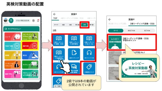 『レシピー』アプリ内のライブラリメニュー「英検対策」から、2級の学習したいコンテンツ(以下参照)を選択し、動画を視聴してください。