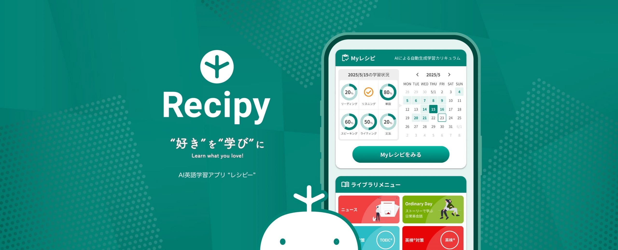 レシピーは英語が趣味になるアプリです。世界中の英語ニュースを使って情報収集するように学習が可能です。レシピー最大の特徴は「AIが英語学習者にピッタリの学習カリキュラムを作成」してくれる「Myレシピ」機能。「Myレシピ」では、英語学習者の「スマホ」と「スキマ時間」を利用して、「最短で最高の成果」を実現することが可能です。