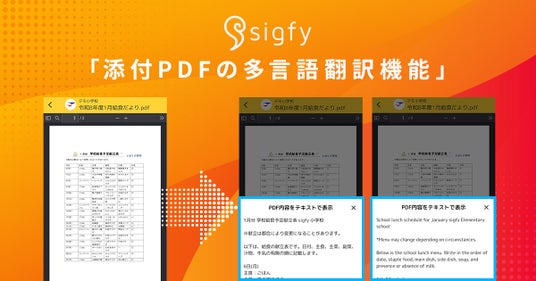 本機能は、sigfy(シグフィー)上のメッセージに添付されたPDFの内容を多言語翻訳することを可能とするもので、現在特許出願中の独自技術を活用しています。学校現場における外国語対応に関する実務負担を大幅に軽減するとともに、保護者への情報伝達をより円滑にすることで、導入団体にとっての利便性および継続利用価値の向上が期待されます。これにより、新規導入の促進ならびに既存ユーザーの定着に寄与し、sigfy(シグフィー)の売上成長および中長期的な市場シェア拡大につながるものと考えております。