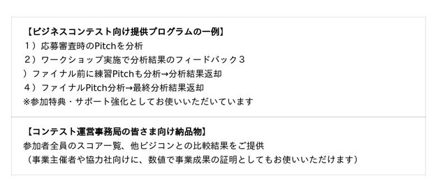 今後も、自治体・企業・大学等が運営する各種アクセラ/ビジネスコンテストに対し、「登壇者の改善に直結するフィードバック」として分析提供を拡大してまいります。