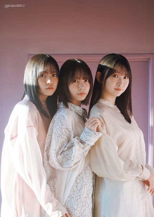 表紙に選ばれたのは、暖かい日差しの中で3人が仲良く身を寄せ合うカット。初めて3人で登場した「B.L.T.2023年6月号」の表紙と同じ並び順になっており、可愛らしくもエモーショナルな表紙に仕上がった。