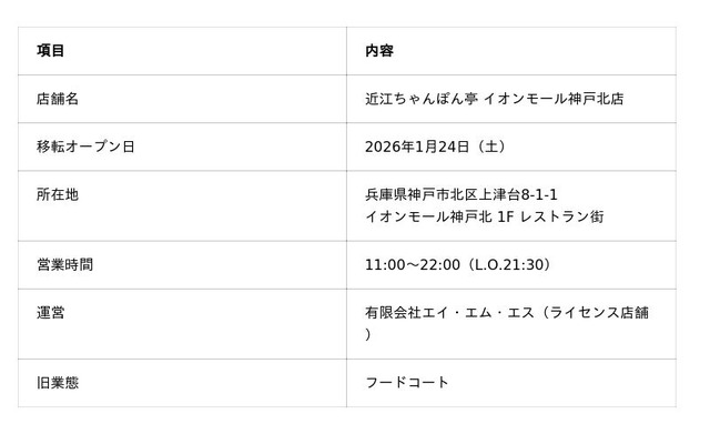 ライセンス店舗「近江ちゃんぽん亭 イオンモール神戸北店」が、