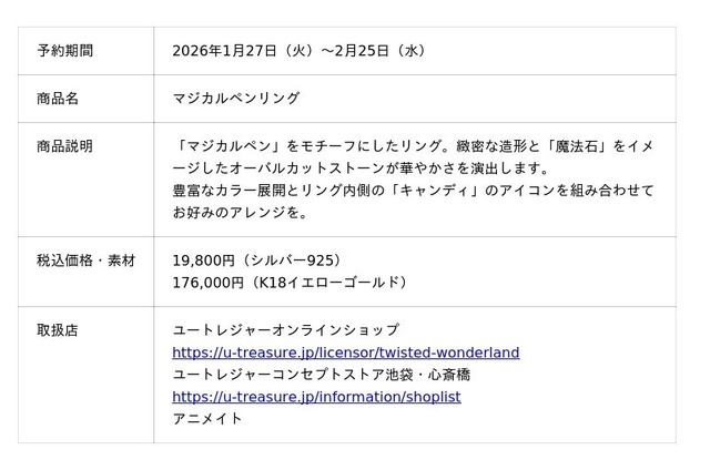 『ディズニー ツイステッドワンダーランド』に登場する「マジカルペン」をモチーフに丁寧にデザインしたリング(指輪)です。オーバルカットのストーンが手元を華やかに演出します。