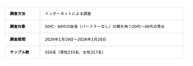 50歳以上限定のマッチングアプリ「Goens(ゴエンズ)」(運営:Goens株式会社/本社:愛知県名古屋市/CEO : 廣澤 和也)は、親の再婚や相続に対する子供世代の本音を明らかにするため、50代・60代の独身の親を持つ20代~40代の男女を対象に意識調査を実施しました。