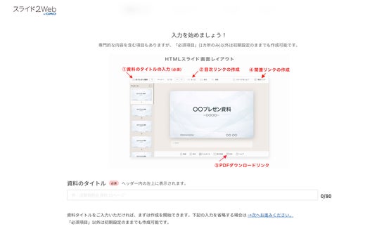 2) スライド情報および必要に応じてSEO・PR項目を入力(「資料タイトル」から自動生成も可能)