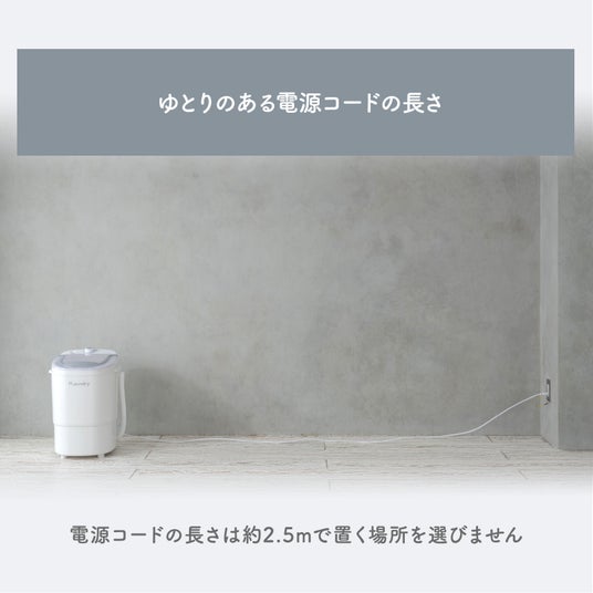 持ち上げて排水するバケツ式のミニ洗濯機では、容量を大きく重くすると排水作業がたいへんになりますが、排水ホースを装備している本品は持ち上げ不要で楽に排水可能です。その排水ホースは、従来品から素材を見直して強度を向上した上で、長さを5cm延長して41cmに変更。さらに、2.5mのロング電源コードを装備することで使用場所の自由度が高くなり、脱衣所やワンルームなどコンセントが限られた場所でも便利です。脱水中に上ぶたを開けると回転が停止するセーフティー機能を搭載しているので、小さなお子様がいるご家庭でも安心して使用できます。