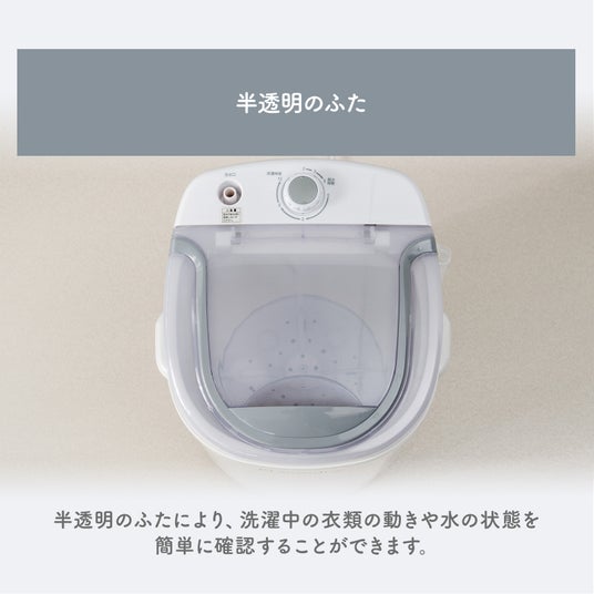 洗濯・すすぎ・排水の機能を備えた予洗いや仕分け洗いに便利な小型洗濯機です。グレーのクリアトップパネルを採用、洗濯中の様子を外から目視で確認できます。