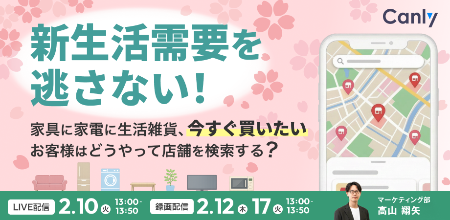 Google ビジネスプロフィール、Yahoo!プレイス、Appleマップなどの3大地図媒体、HP、アプリ、SNSなどの店舗集客媒体の一元管理サービス「カンリー店舗集客」の開発・提供を行う株式会社カンリー(所在地:東京都品川区、代表取締役:辰巳 衛,秋山 祐太朗)は2026年2月10日(火)・12日(木)・17日(火)の3日程で小売・生活雑貨業界向けセミナー【新生活需要を逃さない!家具に家電に生活雑貨、「今すぐ買いたい」お客様はどうやって店舗を検索する?】をオンライン開催いたします。