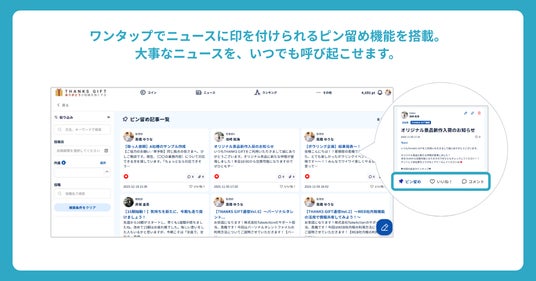 『THANKS GIFT』 は日々の感謝や称賛のコミュニケーションを元に、企業理念に即した行動の承認や応援をコインという形で従業員同士で贈り合うことが可能な組織改善プラットフォームです。
