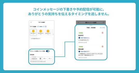 最適なタイミングを逃さずに感謝の気持ちを伝えることができます。リアルタイムでの送信が難しい状況でも、伝えたい瞬間の想いを予約設定しておくことで、さらなる社内コミュニケーションの活性化や、承認・称賛文化の定着を支援します。