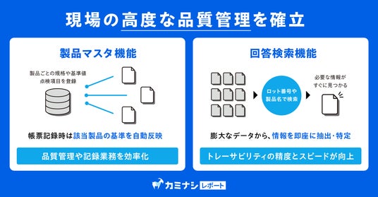 現場DXプラットフォーム『カミナシ』を提供する株式会社カミナシ(本社:東京都千代田区、代表取締役CEO:諸岡 裕人、以下「カミナシ」)は、現場帳票システム『カミナシ レポート』に、「製品マスタ機能」と「回答検索機能」を追加する大型アップデートを実施したことをお知らせします。これにより、品質管理業務の効率化やトレーサビリティのスピードと精度が向上し、高度な品質管理が実施できるようになります。