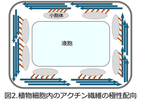 本研究で in vitro により形成されたリング状構造は、植物細胞内で観察される、アクチン繊維が一定方向に極性をそろえて配向した構造とよく似た特徴を示しています(図2)。