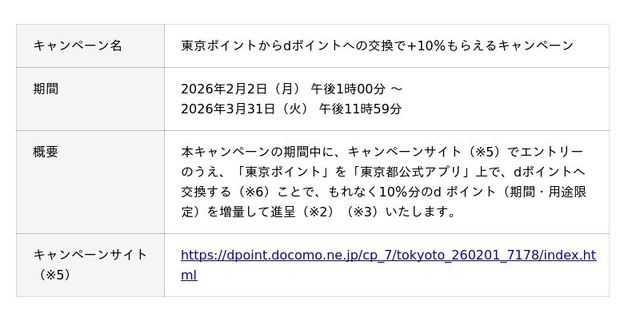 株式会社NTTドコモ(以下、ドコモ)は、東京都が提供する「東京都公式アプリ(R)」(※1)において付与される都独自ポイント「東京ポイント(R)」を「東京都公式アプリ」にて、dポイントへ交換するともれなく10%分のdポイント(期間・用途限定)を増量して進呈(※2)(※3)する「東京ポイントからdポイントへの交換で+10%もらえるキャンペーン」(以下、本キャンペーン)を、2026年2月2日(月)から2026年3月31日(火)までの期間で開催(※4)いたします。