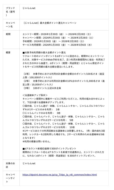 じゃらん遊び・体験:dポイント(通常ポイント1%+キャンペーンポイント98%)+じゃらん限定ポイント1%=100%