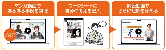 単に動画を見るだけでなく、「1.マンガ動画視聴(事例把握)」→「2.ワークシート記入(思考・言語化)」→「3.解説動画視聴(理論の習得)」の3ステップで進行します。自分の考えをアウトプットした上で解説を学ぶため、知識の定着率が高まります。