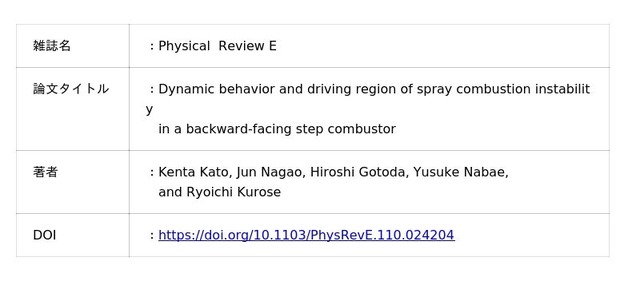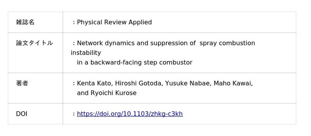東京理科大学工学部機械工学科 後藤田 浩 教授、難波江 佑介 助教、東京理科大学大学院機械工学専攻 加藤 健太(2024年度修了)は、京都大学大学院工学研究科機械理工学専攻 黒瀬 良一 教授、河合 真穂(博士課程1年)との共同研究により、バックステップ型燃焼器で発生する噴霧燃焼振動の挙動解明と抑制を行った。(I) 噴霧燃焼振動の乱流ネットワーク (*1) にスケールフリー性(*2)が現れる。(II) 乱流ネットワーク内に主要なハブ(*3)が形成される。(III) 乱流ネットワークのコミュニティ(*4)を抽出し、コネクターコミュニティ(*5)が形成される領域に障害物を設置することで、噴霧燃焼振動が抑制される。