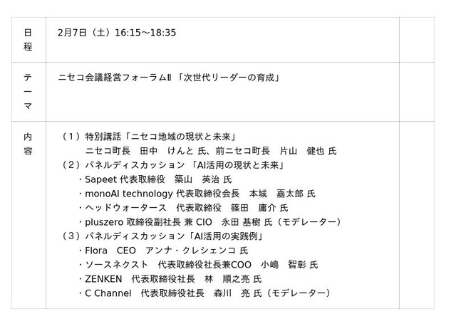 昨年の「ニセコ会議 2025」では、経営者約80名が参加し、「成長企業における有効なM&Aとは」「次世代リーダーの育成」をテーマにしたフォーラムを実施しました。ニセコ町長 片山健也氏や、元オリンピック日本代表 木村公宣氏や、国内外の著名な経営者が登壇し、上場企業の大型合併の状況や、次世代リーダーの育成について活発な討議が行われました。