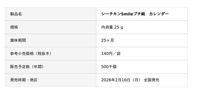 『シーチキン純』シリーズは、食塩・オイル不使用で、原材料はまぐろと天然水だけのシーチキンです。シリーズを通して、低塩分のきはだまぐろと静岡県の天然水のみを使用し、国内の工場で製造しています。今回は、『シーチキンSmileプチ』シリーズから、小容量25gの「シーチキンSmileプチ純」を発売します。既存品のメインユーザーである子育て世代と、食事に気を遣う60歳以上のお客様が、さらに簡単においしくお召し上がりいただけるように、フレークはなるべく細かくして水分を多めに含ませることで、やわらかな食べやすい食感に仕上げました。また、本製品は、店頭で見つけやすいように、カレンダータイプ(壁や棚に吊り下げるタイプ)で販売する仕様になっています。