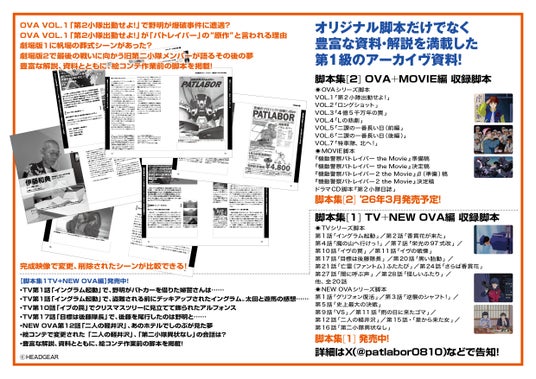 脚本集[2]では、今なお絶大的な人気を誇る劇場版2作(機動警察パトレイバー the Movie・機動警察パトレイバー2 the Movie)の準備稿と決定稿を、そしてシリーズの原作・原点と言えるOVAシリーズの脚本に加え、2万字を超えるロングインタビューを収録したアーカイブ資料の決定版です。