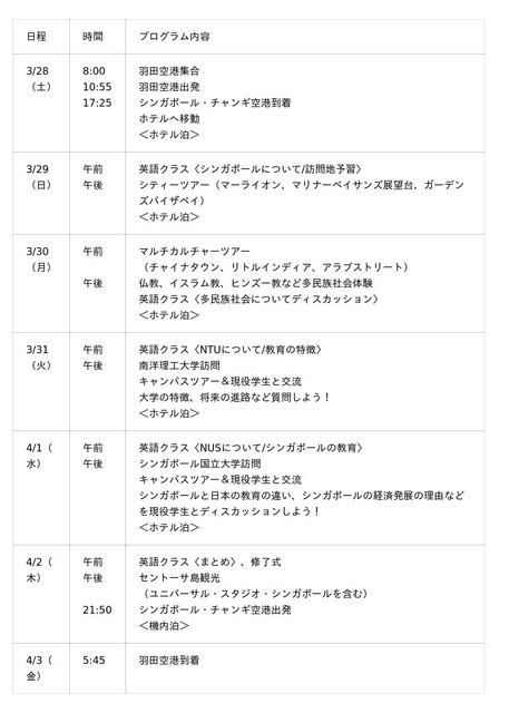 株式会社リソー教育グループ(本社:東京都豊島区、代表取締役:天坊真彦)の子会社である、株式会社プラスワン教育(本社:東京都豊島区、代表取締役:若目田壮志)は、2026年3月28日から7日間の「シンガポール・アカデミックツアー7日間」を開催します。アジア随一の教育・経済先進国シンガポールを舞台に、名門大学訪問と英語実践を組み合わせたアカデミックプログラムです。シンガポール国立大学(NUS)・南洋理工大学(NTU)を訪問し、現役学生との交流やディスカッションに挑戦。