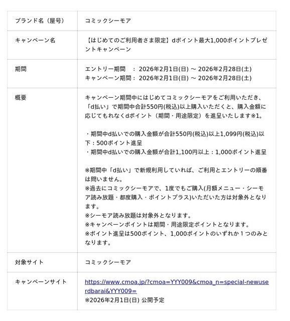 本キャンペーンの参加にはエントリーが必要で、キャンペーン期間中にはじめてコミックシーモアをご利用いただき、「d払い(R)」で期間中合計550円(税込)以上購入いただくと、購入金額に応じてもれなくdポイント(期間・用途限定)を進呈いたします※1。