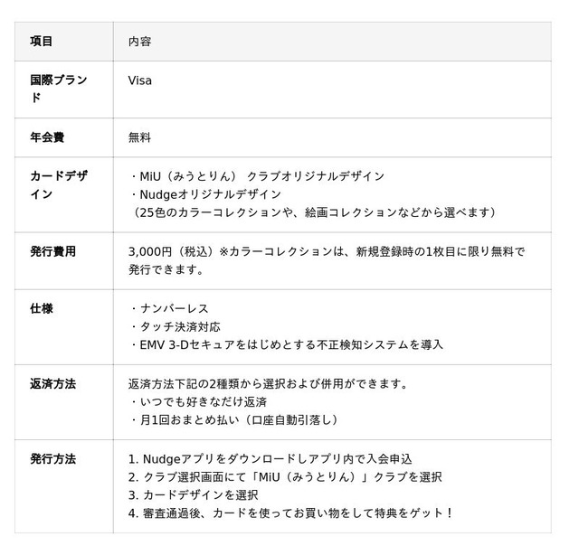 「MiU(みうとりん)」クラブへのご入会で、クラブ限定のオリジナルデザインカードを発行いただけます。カード番号の印字をなくしたナンバーレス仕様のため、デザイン性に加え、セキュリティ面でも安心してご利用いただけます。