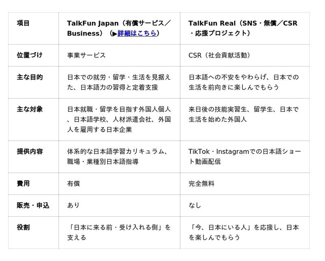 TalkFun Japan(有償サービス)と TalkFun Real(無償CSR)の比較