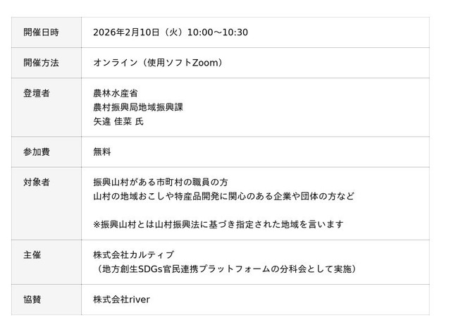 企業版ふるさと納税を活用した地域課題解決プラットフォーム「river(リバー)」を運営する株式会社カルティブ(本社:神奈川県横浜市、代表取締役:池田 清)は各省庁の出している補助金・交付金の活用方法を伝える「地方創生制度活用シリーズセミナー」として、2026年2月10日(火)に農林水産省担当者によるオンラインセミナー「山村の地域資源の活用~山村活性化支援交付金について~」についてを開催します。