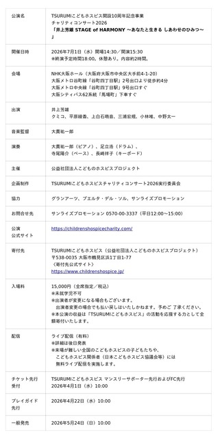 2026年7月1日(水)、公益社団法人こどものホスピスプロジェクトは、同法人が運営する「TSURUMIこ どもホスピス」開設10周年を記念し、NHK大阪ホールにて、チャリティコンサート 「井上芳雄 STAGE of HARMONY ~あなたと生きる しあわせのひみつ~」 を開催いたします。