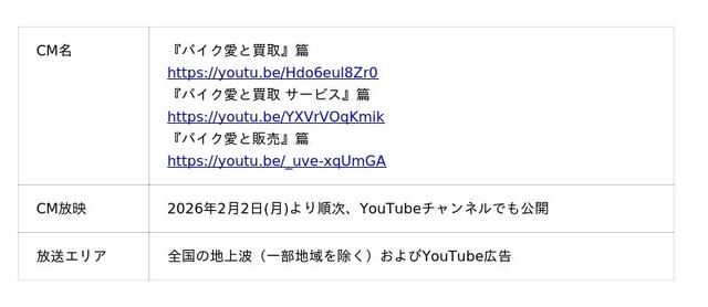 「常識を壊し、新たな価値と感動を生む」を企業理念に掲げ、「バイクライフの生涯パートナー」の実現に向けて、事業を展開する株式会社バイク王&カンパニー(代表取締役CEO:澤 篤史、本社:東京都世田谷区、証券コード:3377、以下「当社」)は、2026年2月2日(月)より、新TVCM(以下「新CM」)の放送を全国で開始いたします。