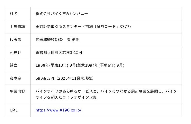 株式会社バイク王&カンパニーは、1994年9月に「バイクライフのあらゆるサービスと、バイクにつながる周辺事業を展開し、バイクライフを超えたライフデザイン企業」として創業。中古バイクの買取・販売を主力事業とし全国に店舗を展開、バイクの売買・整備・パーツ販売・レンタルなど、バイクライフを総合的にサポートしています。近年は、中古バイクだけでなく、新車販売、パーツ・用品販売、レンタルバイクや電動モビリティなど、バイクライフを超えた幅広いモビリティ関連事業へと領域を拡大しています。