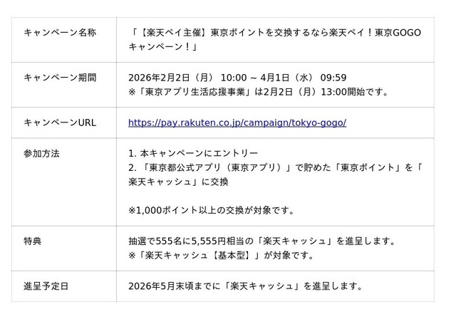 楽天ペイメント株式会社(以下「楽天ペイメント」)は、2026年2月2日(月)より東京都が開始する「東京アプリ生活応援事業」(注1)に合わせ、「【楽天ペイ主催】東京ポイントを交換するなら楽天ペイ!東京GOGOキャンペーン!」(以下「本キャンペーン」)を、2026年2月2日(月)から4月1日(水)まで実施することをお知らせします。