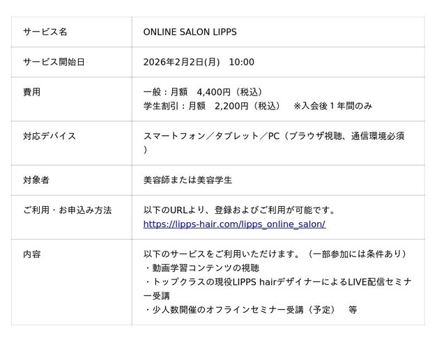 メンズコスメ商品の企画・販売、ヘアサロンFC事業を営む株式会社リップス(本社:東京都渋谷区、代表取締役:的場隆光、以下「LIPPS」)は、美容師・美容学生を対象としたサブスクリプション型eラーニングサービス「ONLINE SALON LIPPS(以下「本サービス」)」を2026年2月2日(月)より提供開始いたします。本サービスでは、LIPPSが創業した1999年から26年にわたり培ってきた「メンズヘアの技術や知識、考え方」を体系化し、場所や時間に縛られず学べるオンライン学習環境を提供します。