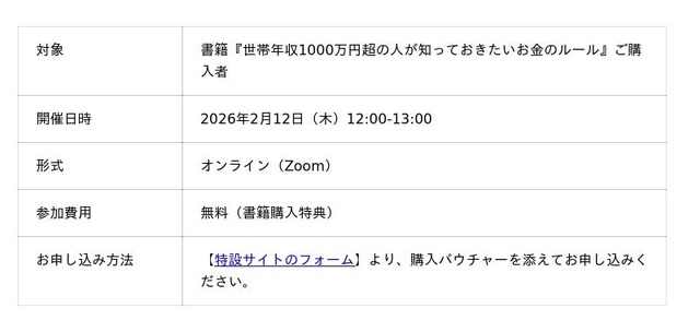 富裕層専門税理士として30年のキャリアを持つ森田貴子(株式会社ウィル・シャイン代表)は、2025年12月22日に刊行された著書『資産増、年収増、余裕増 世帯年収1000万円超の人が知っておきたいお金のルール』(あさ出版)の購入者を対象とした、特別オンラインセミナーを開催いたします。